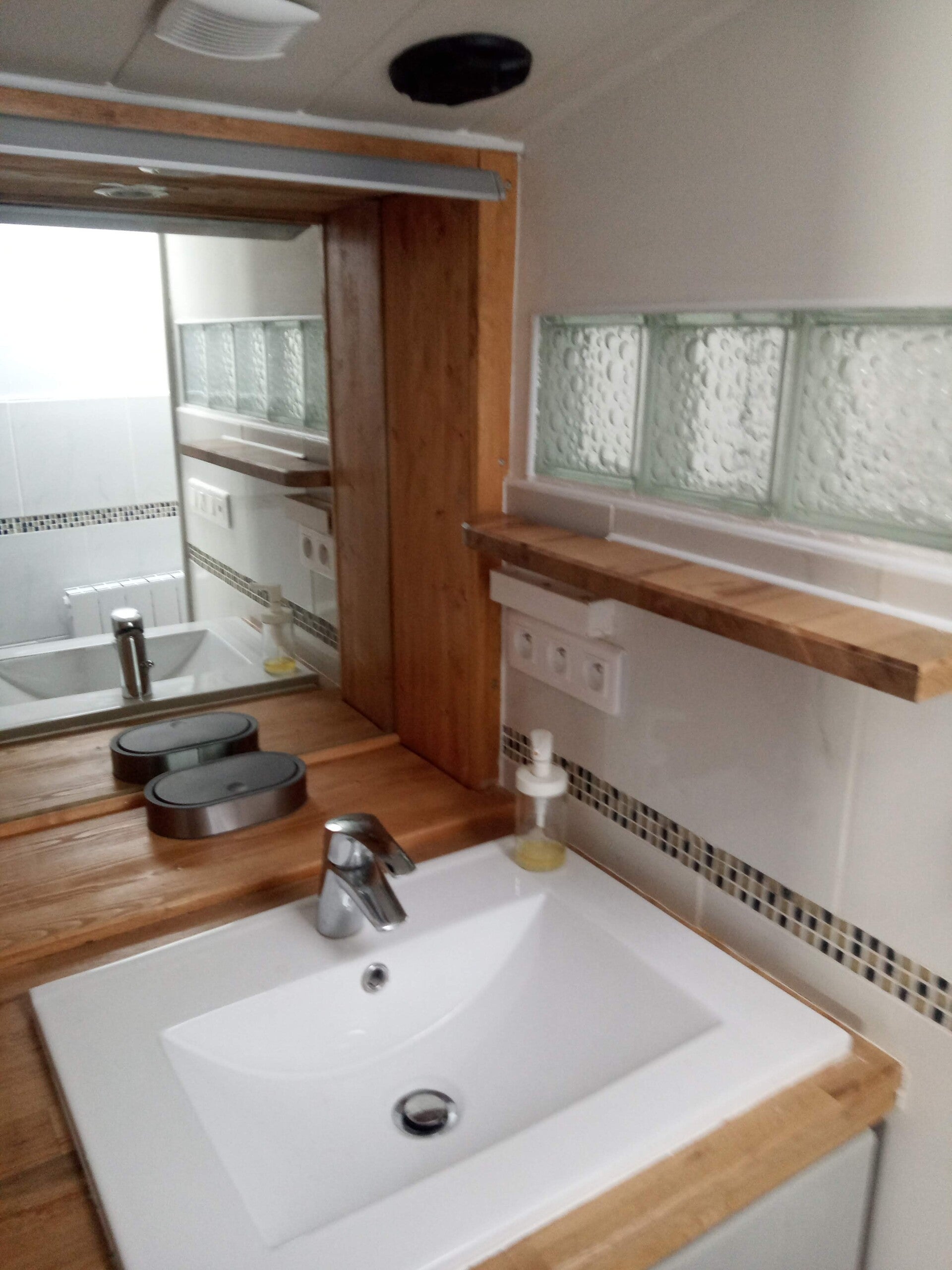 Lavabo avec meuble, plan avec poubelle, paroi avec tablette cube de verre (éclairage changeant intégré)